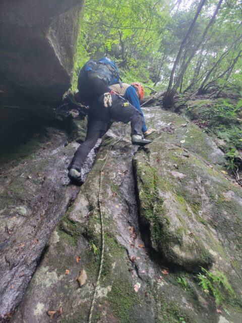典型的な歩き沢でした。雨で夜はたき火できず、寒い夜を過ごすことに。久しぶりの泊まり装備が重かったです。カメラが破損し、あまり写真を撮れませんでした。