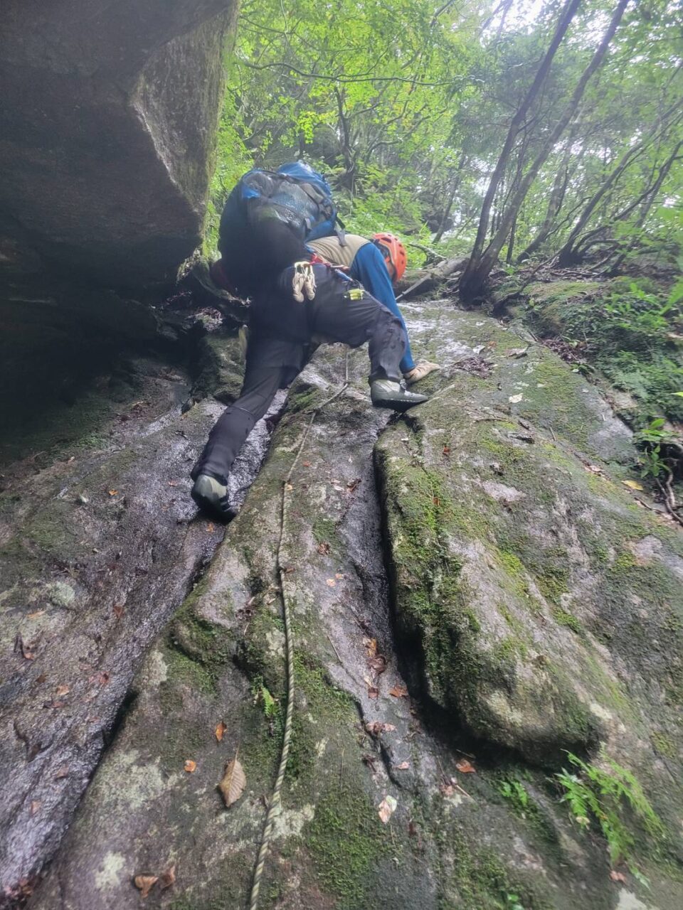2日目、ナメ滝が続く中を遡行していきます。キレイなんですが、最近紀伊半島の沢で贅沢しすぎたためか、罰あたりなことにとても退屈。。。あと、事前情報なしだったので、乗越沢の入口を通り過ぎました。次の沢まで行って気づいて引き返しました。乗越沢は急斜面の暗い沢で、詰めはなかなか大変でした。