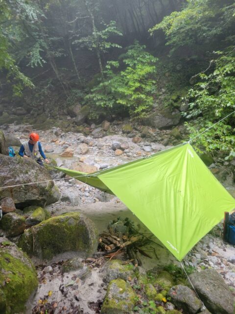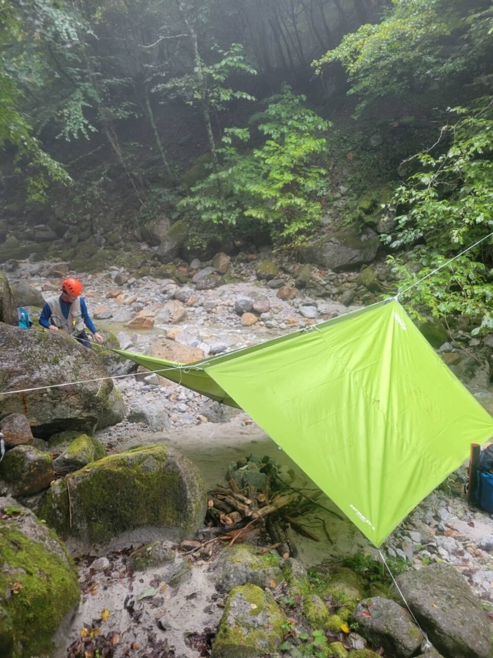 ビバークは、対岸からビニールひもを渡し、砂地にタープを張って、寝床は完璧でした。ただ焚火を焚けなかった上、ガスも持っていなかったため火は起こせず。パンだけ食べて就寝。ずぶ濡れでしたが、エマージェンシーシートのお陰でなんとか寝れました。翌朝は、薪をタープ下で干していたお陰かなんとか焚き火成功。丸一日ぶりの暖かメシが身にしみました。