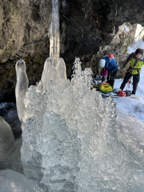歩きやすい登山道を40分くらいでアイスガーデンの分岐。そこからさらに1時間でブライダルベールに到着。すでに3人パーティーが登攀されていました。お邪魔しないように滝裏に入ったら、きれいな氷柱や氷筍がたくさん!溶けて丸くなった氷筍もかわいい~!(^^)!サッサと昼食を食べて時間許す限り撮影タイム♬