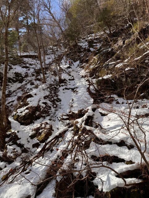 スタート時の気温マイナス2度。昨年ツアーでアイスガーデンまで行ってたので雪の少なさに一抹の不安…。歩き始めて20分くらいで徐々に登山道にも雪が増え始めたのでチェンスパを装着。
