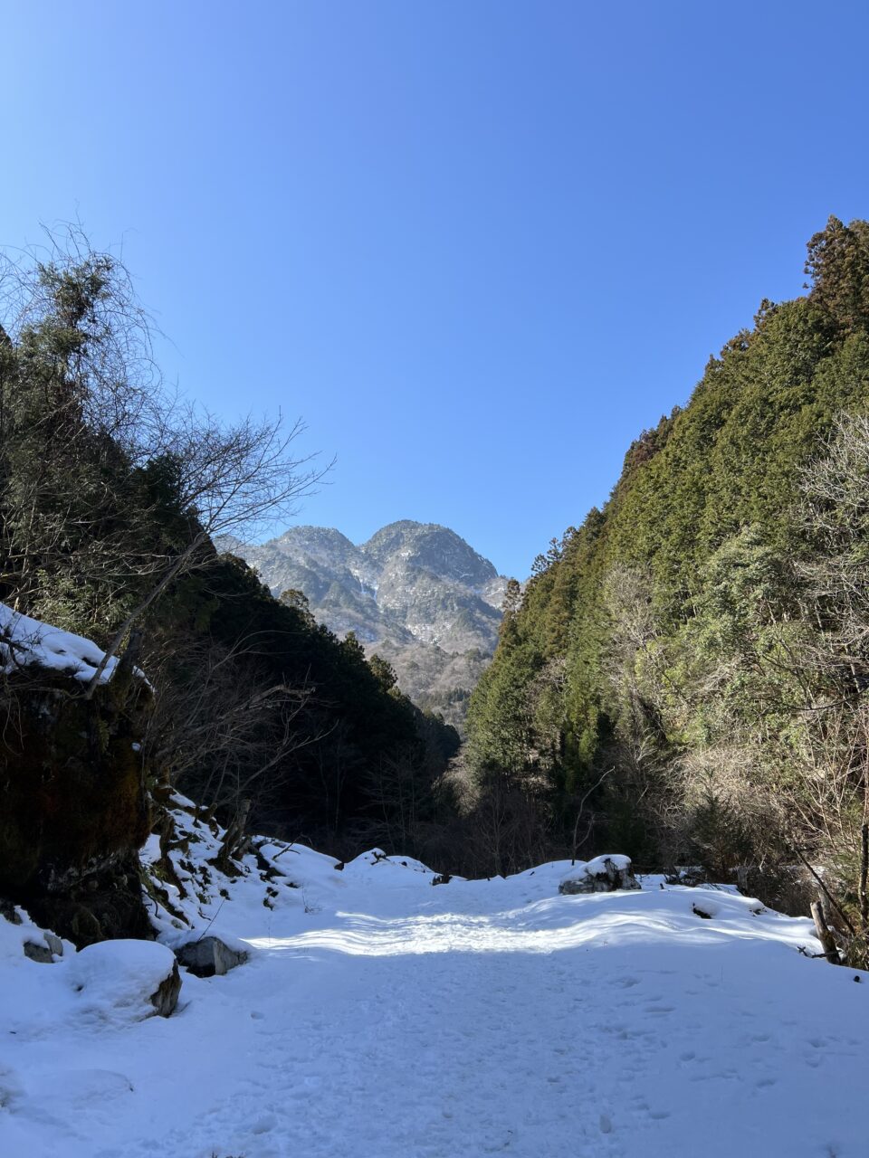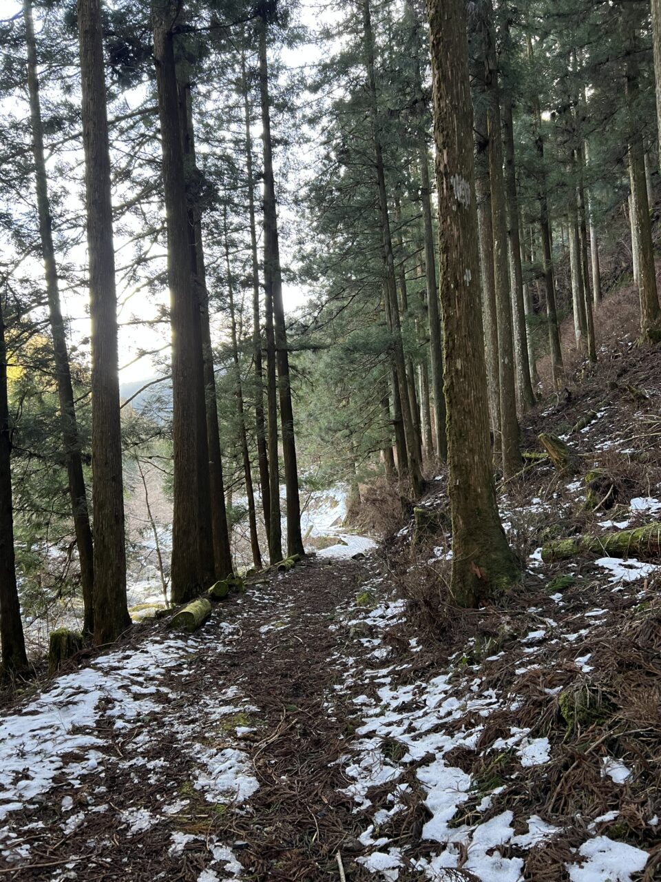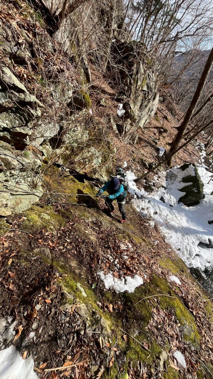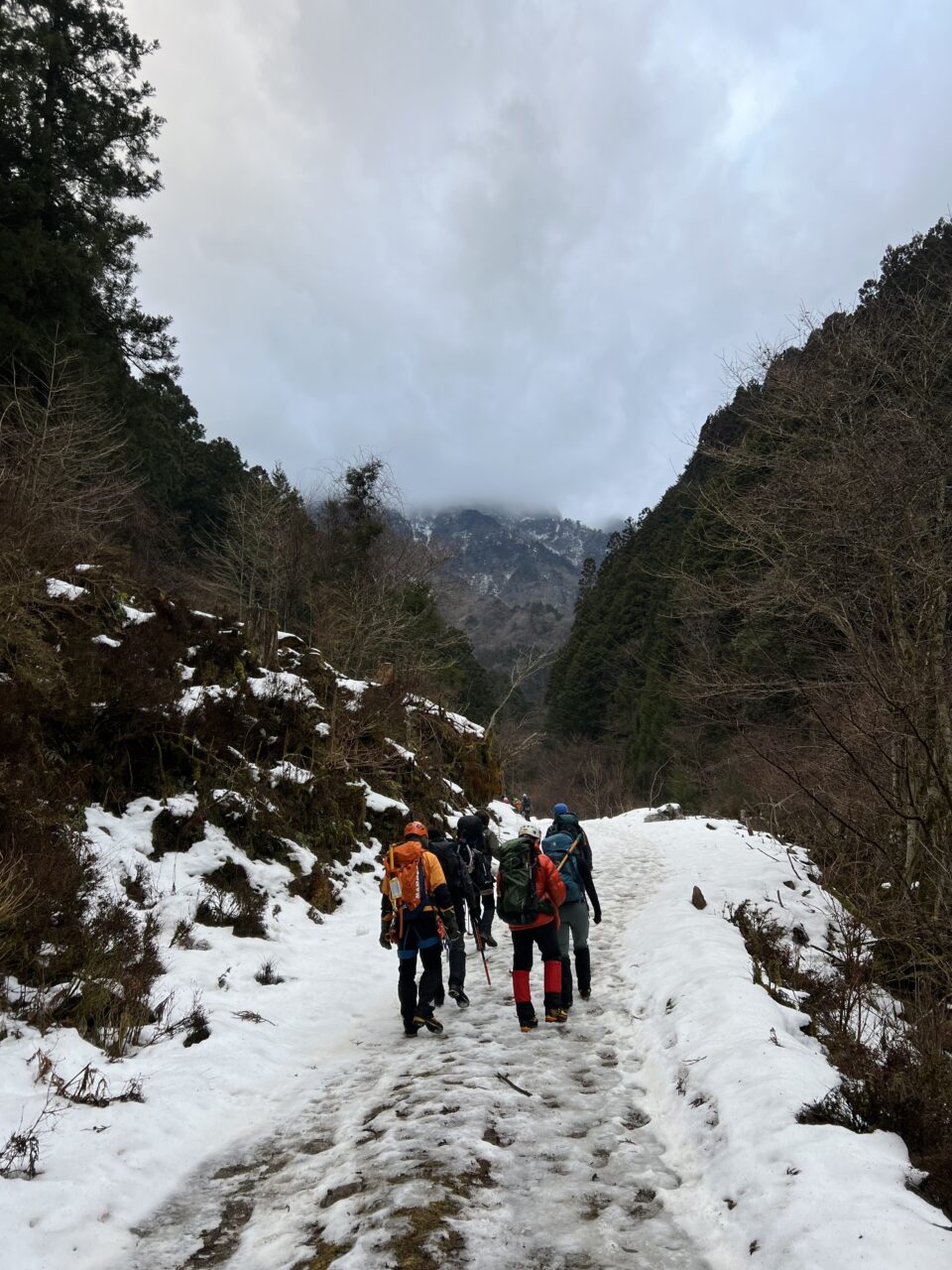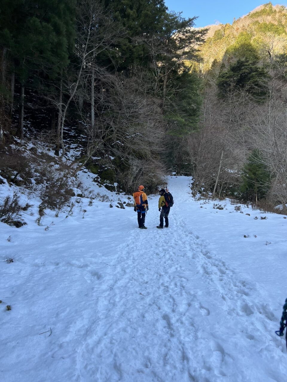 スタート時の気温マイナス2度。昨年ツアーでアイスガーデンまで行ってたので雪の少なさに一抹の不安…。歩き始めて20分くらいで徐々に登山道にも雪が増え始めたのでチェンスパを装着。