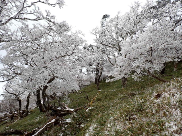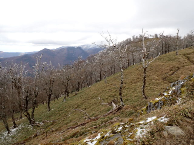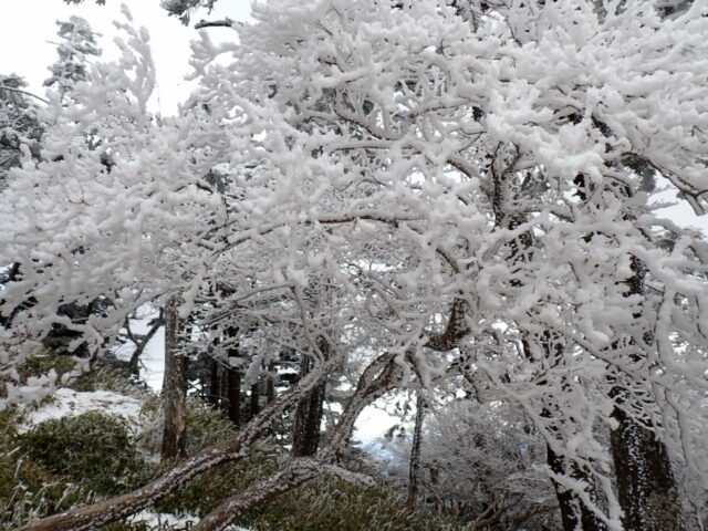 歩き始めて半ばを過ぎたころから樹氷がちらほらと見えはじめ 古田の森のあたりからは積雪と樹氷が花盛り。