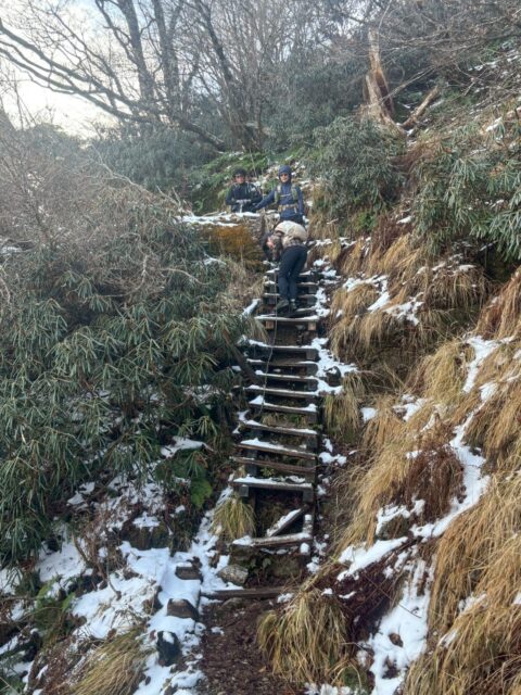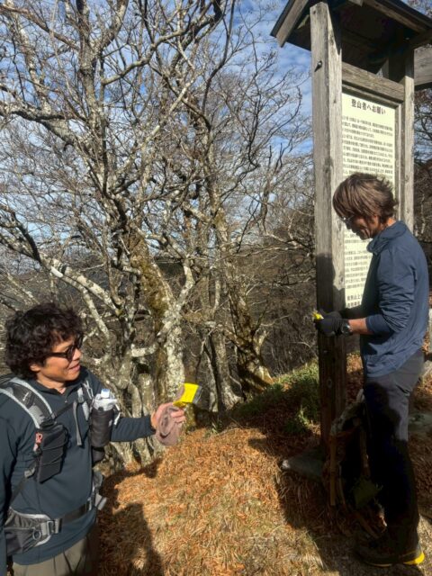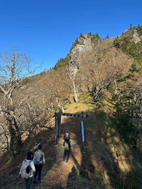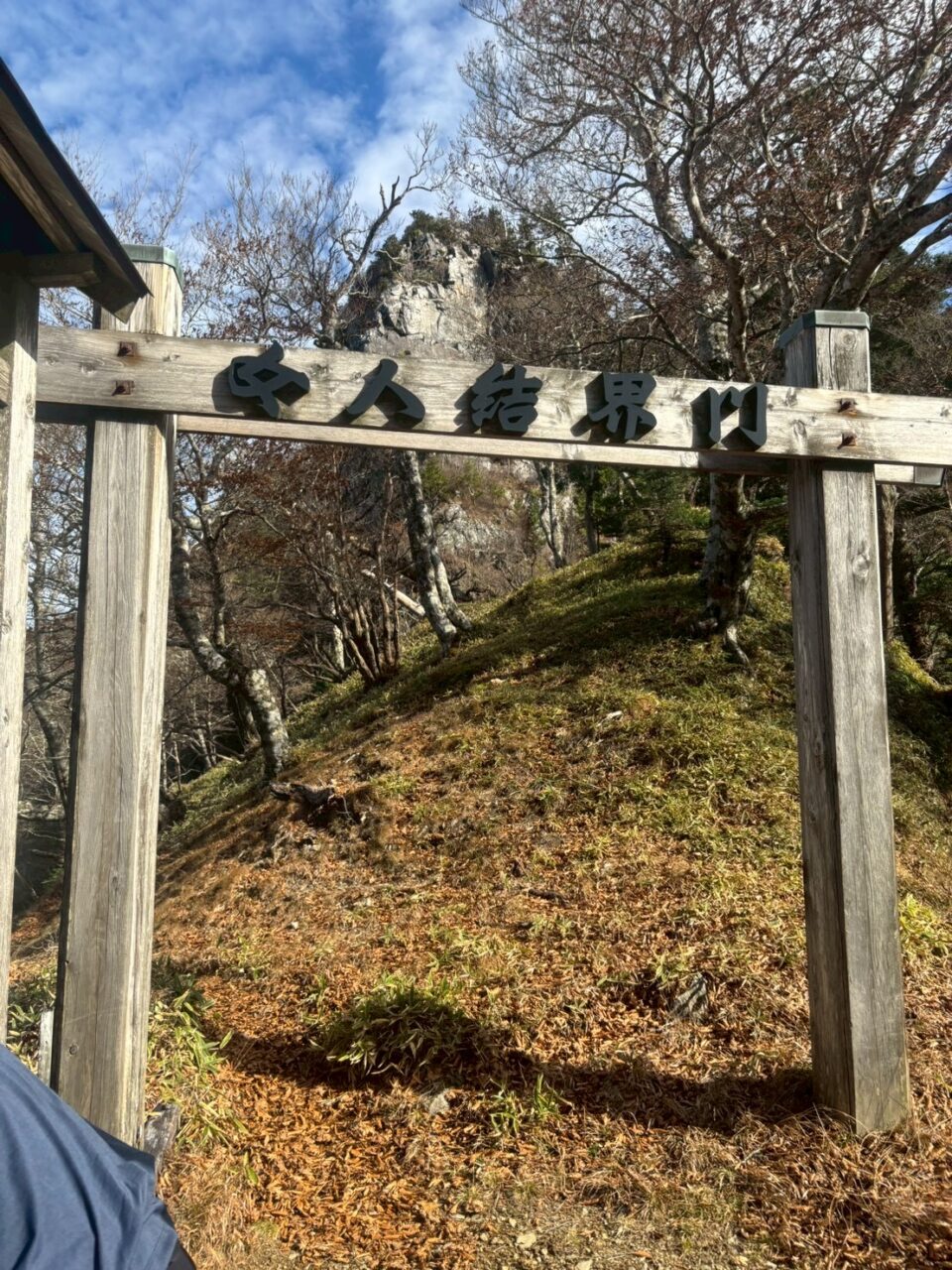 10:30 レンゲ辻へ続く最後の急登を登り、女人結界門の前へ到着!すごい迫力と雰囲気でした。この辺りから雪や霜が足元に出現。道も狭く滑落する危険もあったので、トモさん・ユリさん・私はチェーンスパイクを装着。装着時の安心感が大きくそこからはペースも少し速まりました。