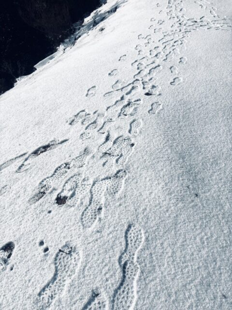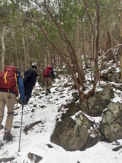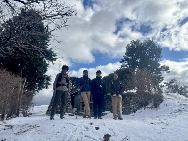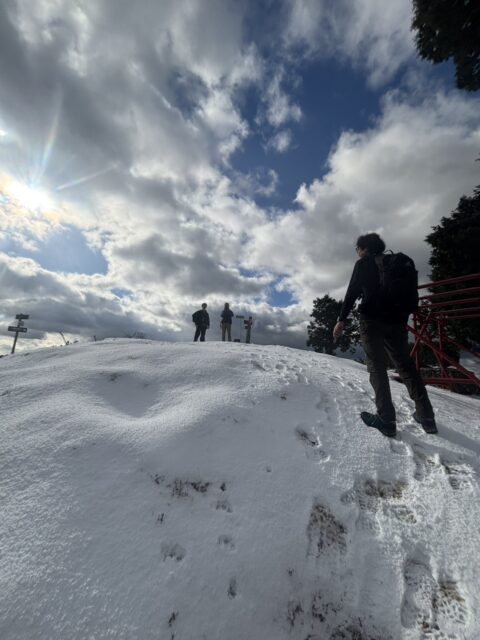地面にふり積もった少し粒子の大きい雪は、白や半透明で金平糖のようで美味しそう。急登がずっと続きましたが、目の前の白に覆われた光景や、ギュッギュッと踏みしめる感触を楽しんでいるうちに約1時間半ほどで山頂に到着。