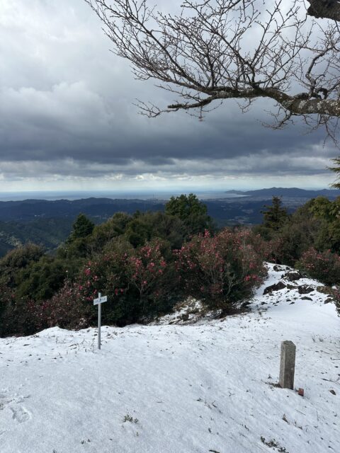 普段は芝で緑色なのに、今日の山頂は真っ白に。そんな中に咲くピンク色のサザンカが華やかに出迎えてくれ、パノラマの山頂の冬景色もとってもきれいでした。Sさんがザックに入っていた水筒から、御神酒を注いで山頂にある祠にお供えを・・・。