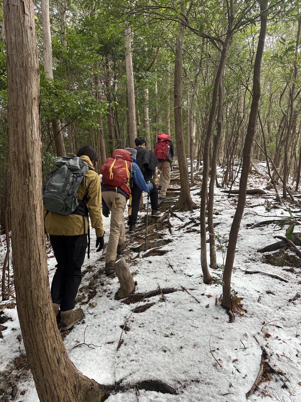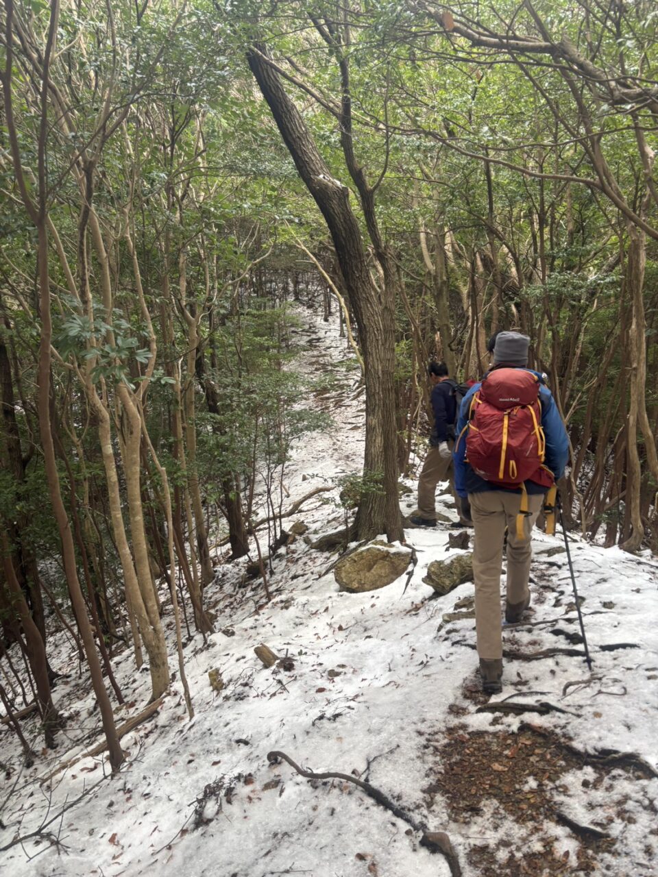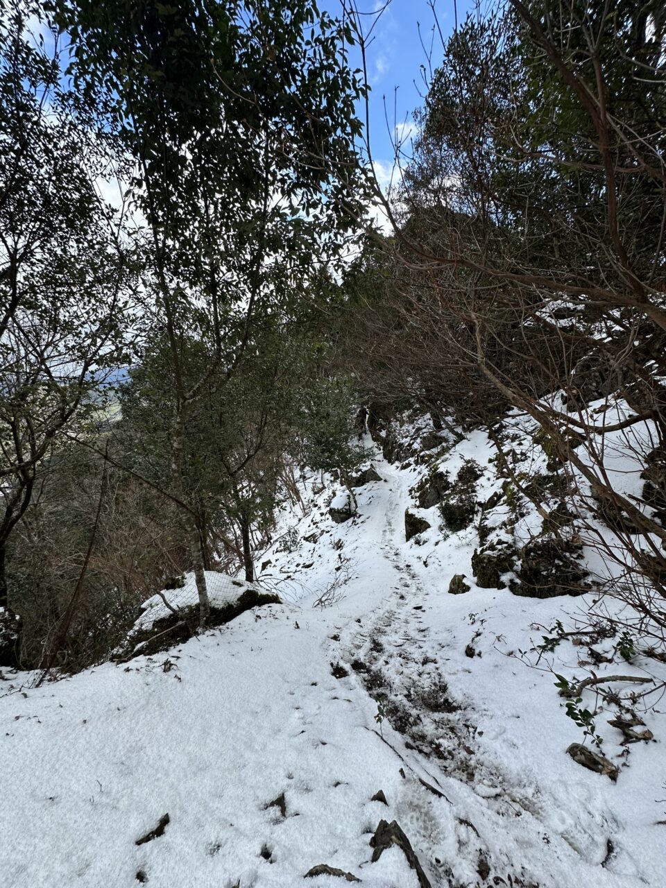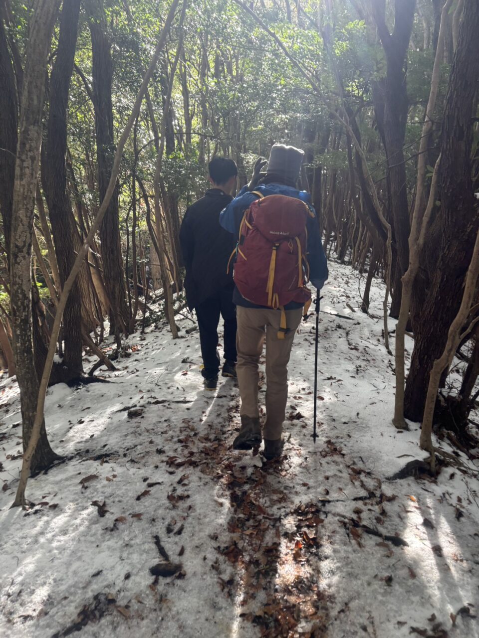地面にふり積もった少し粒子の大きい雪は、白や半透明で金平糖のようで美味しそう。急登がずっと続きましたが、目の前の白に覆われた光景や、ギュッギュッと踏みしめる感触を楽しんでいるうちに約1時間半ほどで山頂に到着。