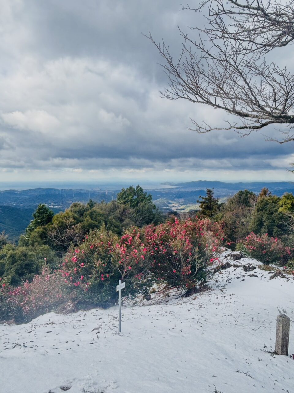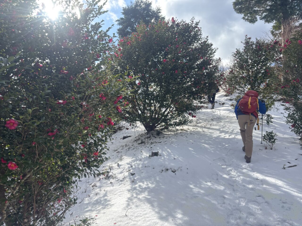 普段は芝で緑色なのに、今日の山頂は真っ白に。そんな中に咲くピンク色のサザンカが華やかに出迎えてくれ、パノラマの山頂の冬景色もとってもきれいでした。Sさんがザックに入っていた水筒から、御神酒を注いで山頂にある祠にお供えを・・・。