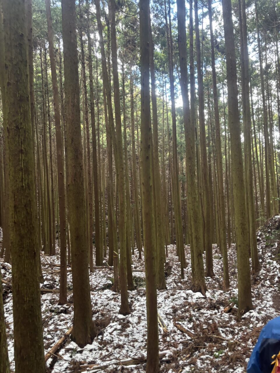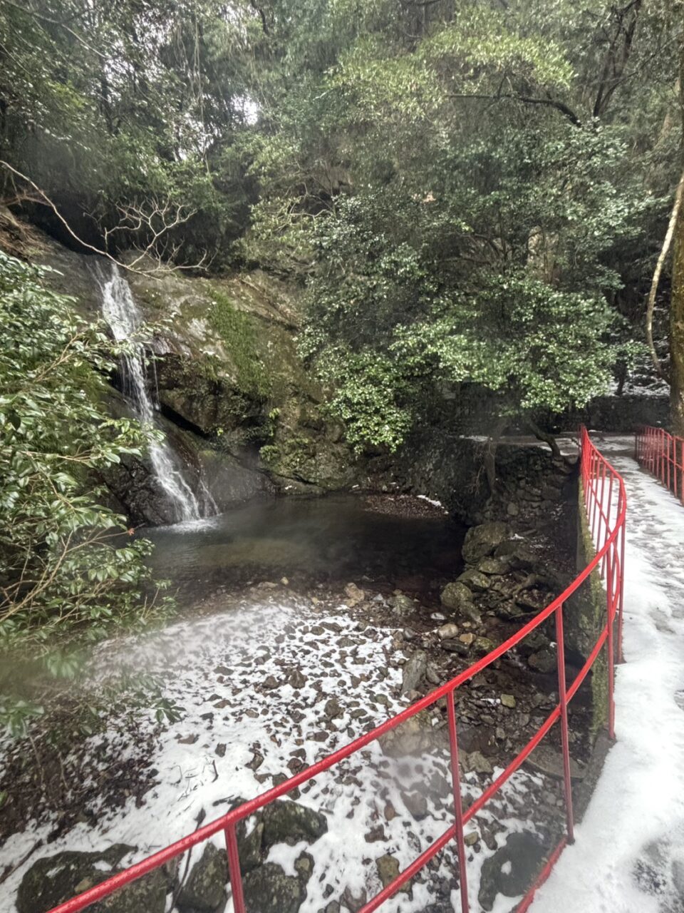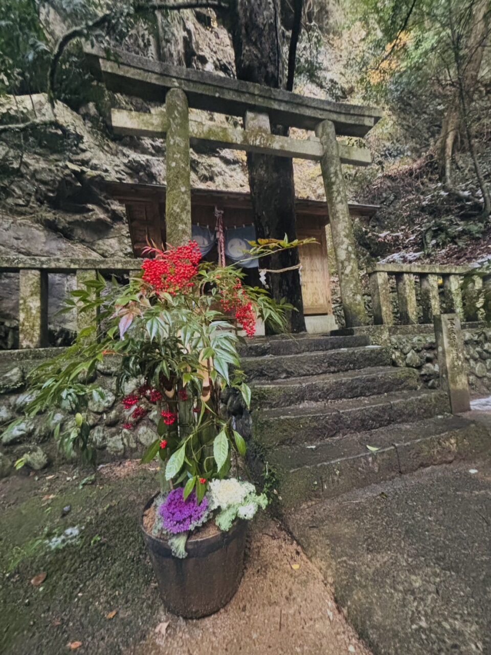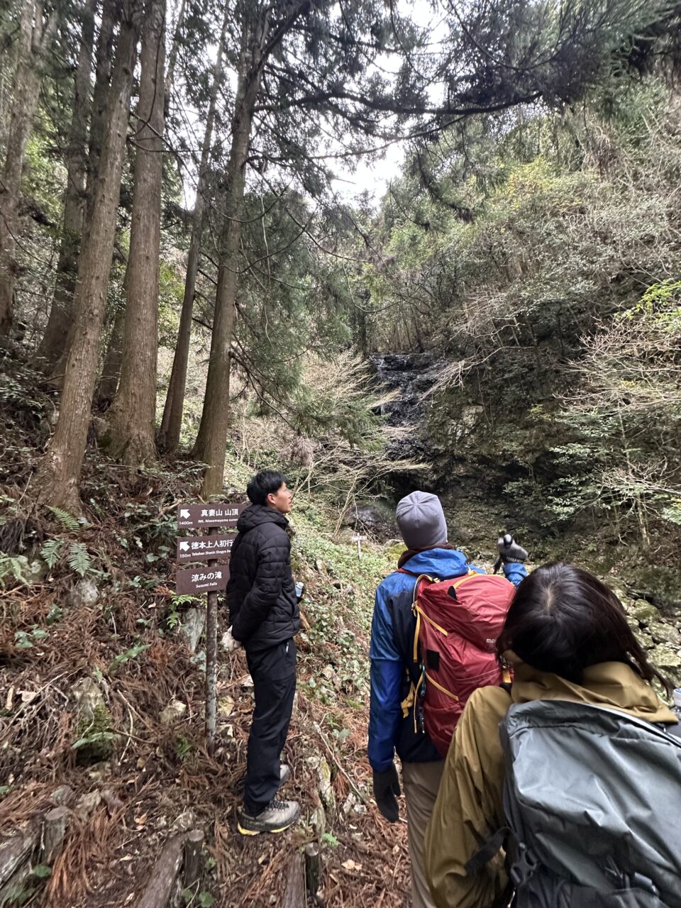 山頂で少し休憩してから、Hさん、Yさんとは山頂で別れ、残り3名で御滝神社へ向かいながら下山。植林地の針葉樹林の山道を約1時間下り、御滝神社へ到着。小さな滝がある神社で、三が日ということで鳥居の前には門松が飾られており、とても風情のある神社でした。