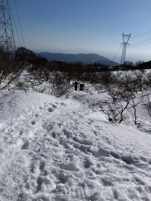 登山口でアイゼンを付け、緩やかに登っていくと武奈の木平の東屋に出る。雪道に時々突き出てくる枝を避けつつ鉄塔をめざしていくと、ほんの少しだけ急な箇所があって、軽アイゼンで苦戦されてる方がいたので、我々は12本爪を履いてて良かったと思いました。(とはいえ周りはチェーンスパイクが多かった気がする。スノーシューも多くはなかったのは、気温が高かったからかな…?)