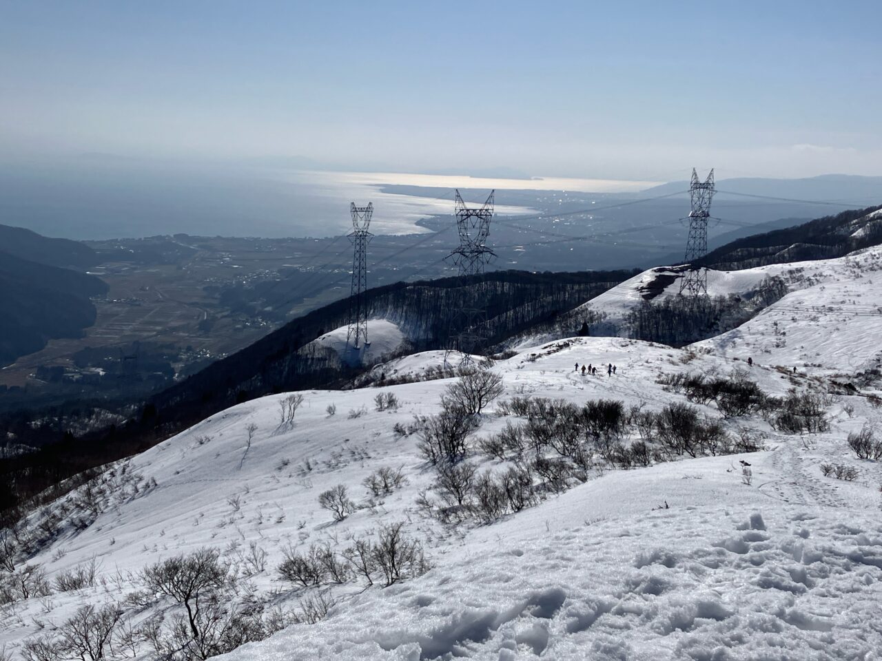 粟柄越でスノーシューを履いたら、あとは稜線歩きで伊吹山や琵琶湖も見渡せる眺望のなか、穏やかなスノーハイキングでした。