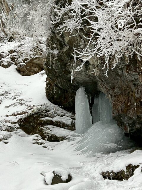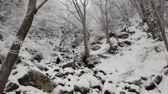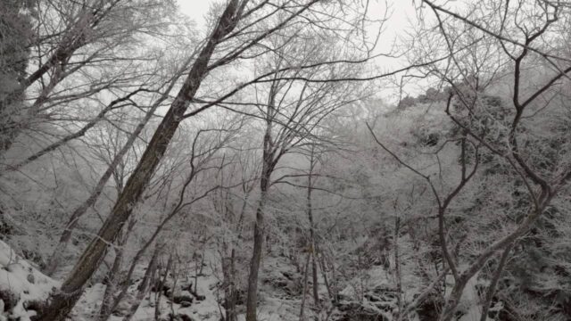 明神平に向けて歩き始めると、ほどなく足元を雪が覆いました。最初は渓谷沿いを進み、2回の渡渉。2度目の渡渉点からみるミョウジン谷の滝は凍りついてすごかった。このあたりから、霧氷がいい感じに。ちょうど追いついてきた女性の方が即席でチームに加わり、八人で明神平に進むことに。この滝下で、チェーンスパイクやアイゼンを持っているメンバーはそれらを装備しました。ただ僕とタケ君は、ツボ足で滑らず歩く練習も必要と思い、あえてツボのまま進むことにしました。キックステップの練習ですね。
