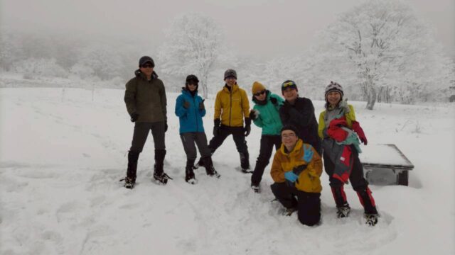 ぱっと視界が開け、明神平の小屋が目の前に。東屋で一休みの後、背負ってきたスノーシューの出番。新兵器のスノープラックを装備のイワイワさん、ものすごい軽快!これはすごい、言うてみれば、ワカンとスノーシューのいいとこどり。つけたまま忍者のように走ってる。