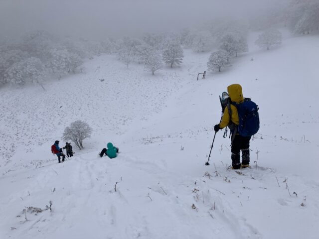 明神平に向けて、どんどん雪景色に変わっていきました。つづら折りの中部周辺(1200m付近)ではやや風が強くなり、ここで冬ヤッケ等を装備。ただ、ここがなぜか(山頂付近と比較しても)一番風が強く、上はさほどでもなかったです。