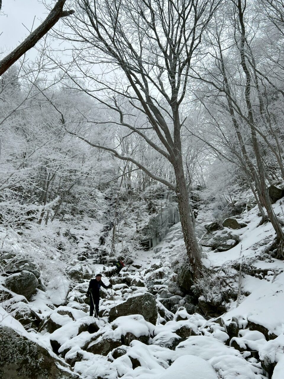 明神平に向けて歩き始めると、ほどなく足元を雪が覆いました。最初は渓谷沿いを進み、2回の渡渉。2度目の渡渉点からみるミョウジン谷の滝は凍りついてすごかった。このあたりから、霧氷がいい感じに。ちょうど追いついてきた女性の方が即席でチームに加わり、八人で明神平に進むことに。この滝下で、チェーンスパイクやアイゼンを持っているメンバーはそれらを装備しました。ただ僕とタケ君は、ツボ足で滑らず歩く練習も必要と思い、あえてツボのまま進むことにしました。キックステップの練習ですね。