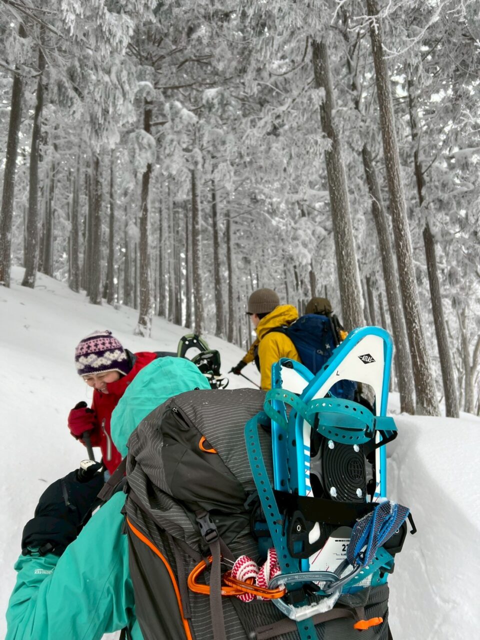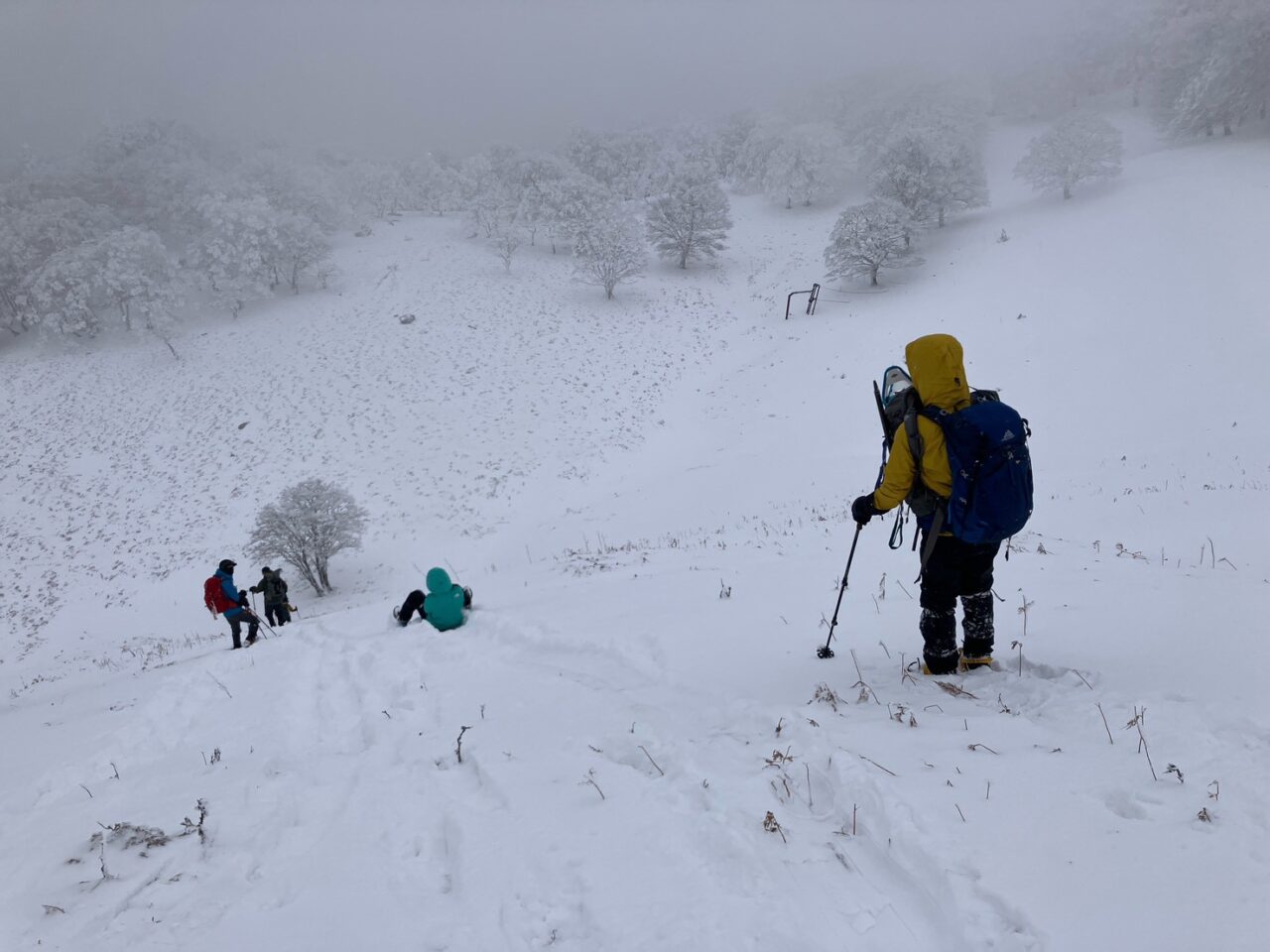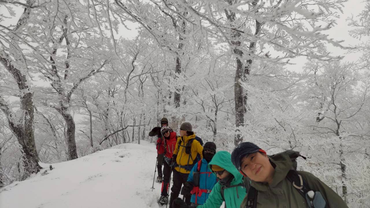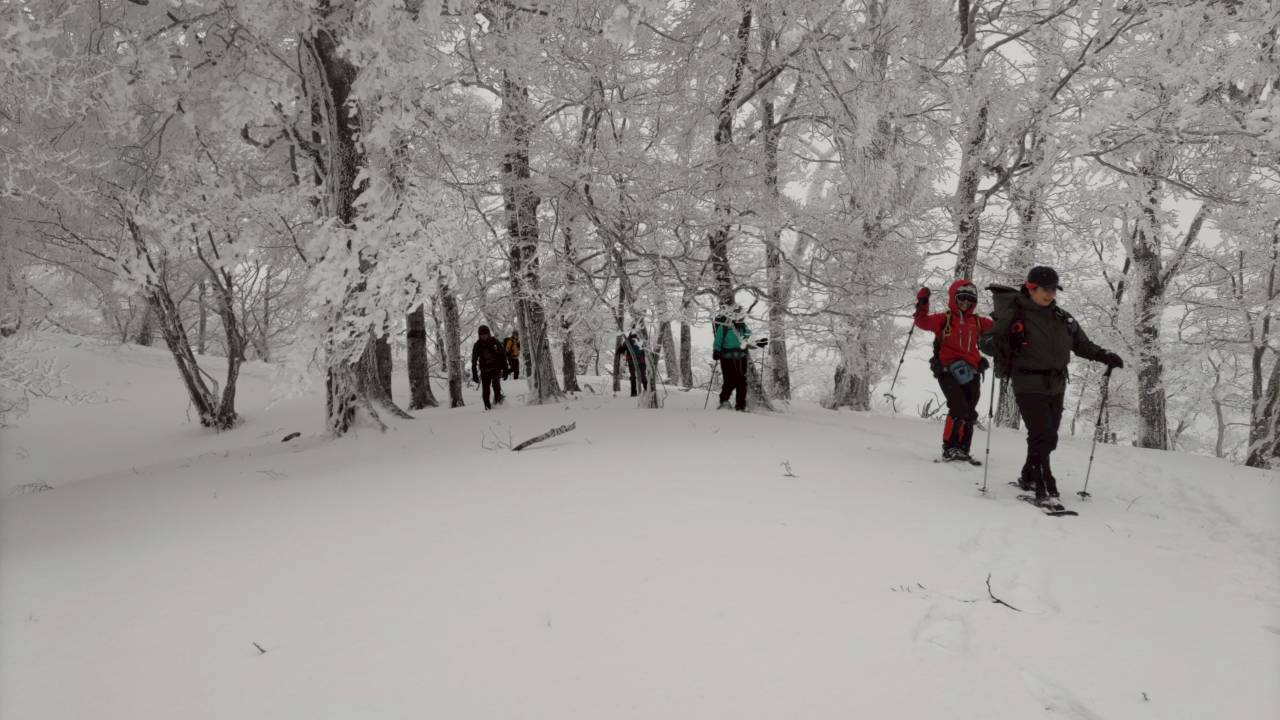 明神岳から前山を周回し、再び明神平へ。この間、美しい樹林に雪がついて、素晴らしい景観が広がりました。ガスがかかっていたので、晴れればよりきれいだろうなと思い、そこは残念でしたが。senさんは、ここでヒップそりを投入。皆面白いもの持ってくるなあと感心。深雪で苦戦しながらも楽しそう。