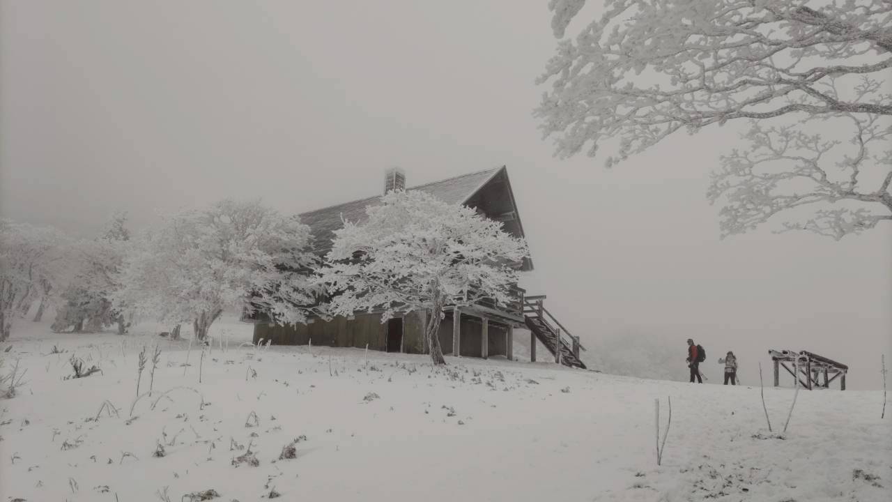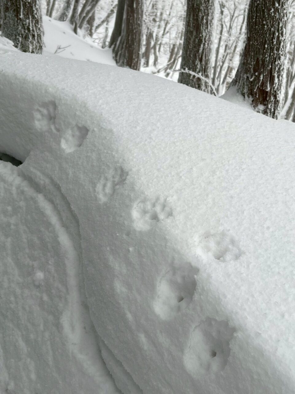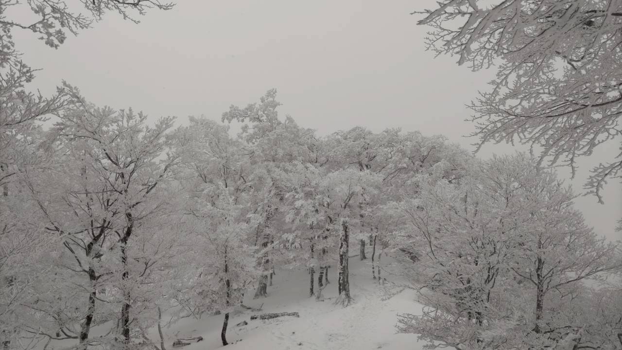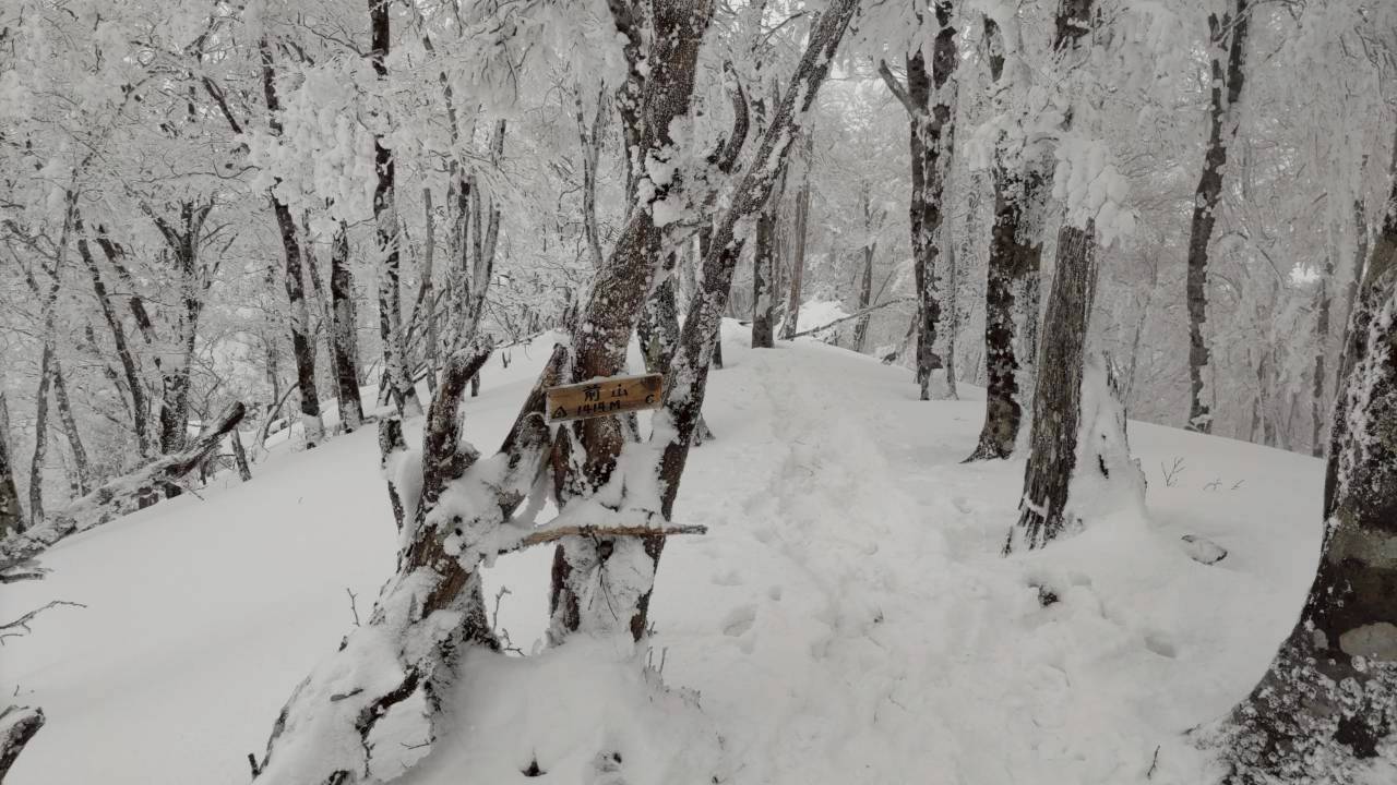 明神平に向けて、どんどん雪景色に変わっていきました。つづら折りの中部周辺(1200m付近)ではやや風が強くなり、ここで冬ヤッケ等を装備。ただ、ここがなぜか(山頂付近と比較しても)一番風が強く、上はさほどでもなかったです。