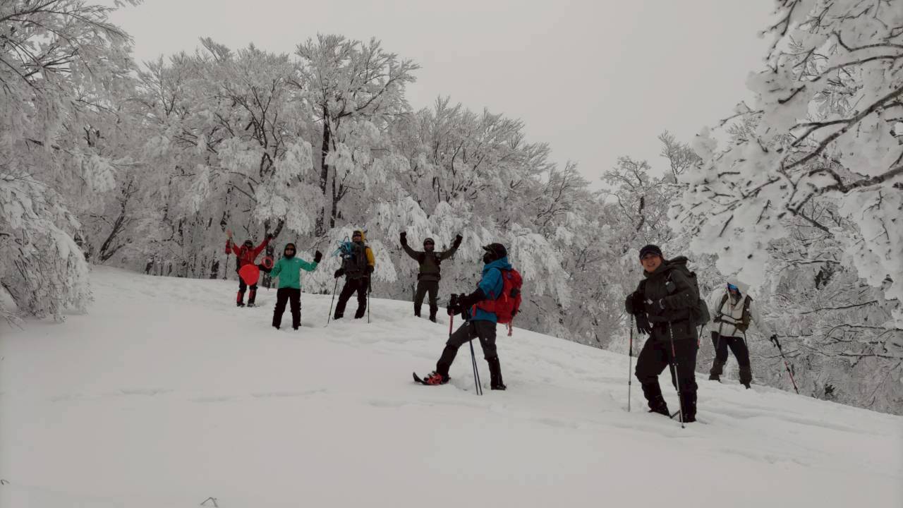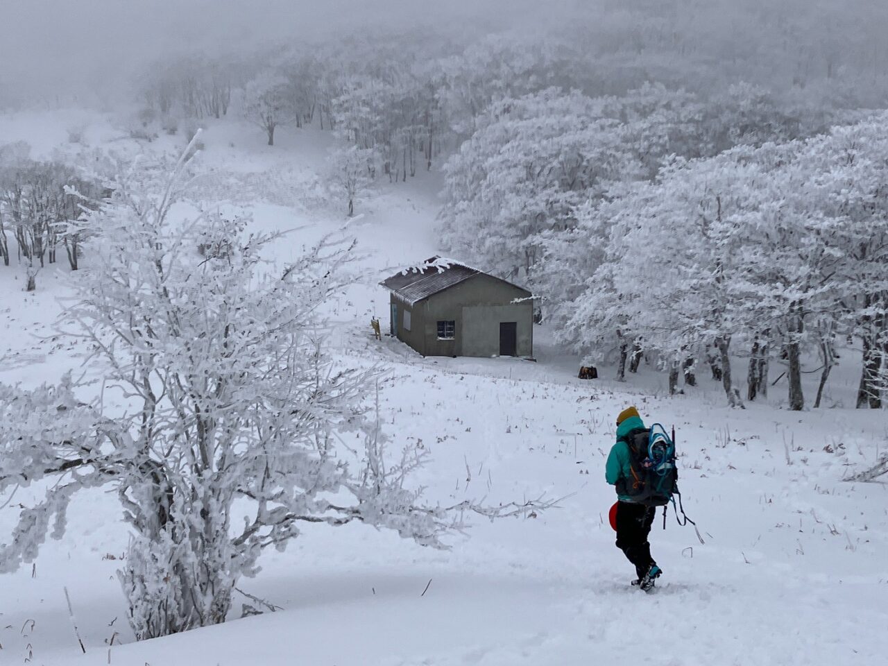 ぱっと視界が開け、明神平の小屋が目の前に。東屋で一休みの後、背負ってきたスノーシューの出番。新兵器のスノープラックを装備のイワイワさん、ものすごい軽快!これはすごい、言うてみれば、ワカンとスノーシューのいいとこどり。つけたまま忍者のように走ってる。