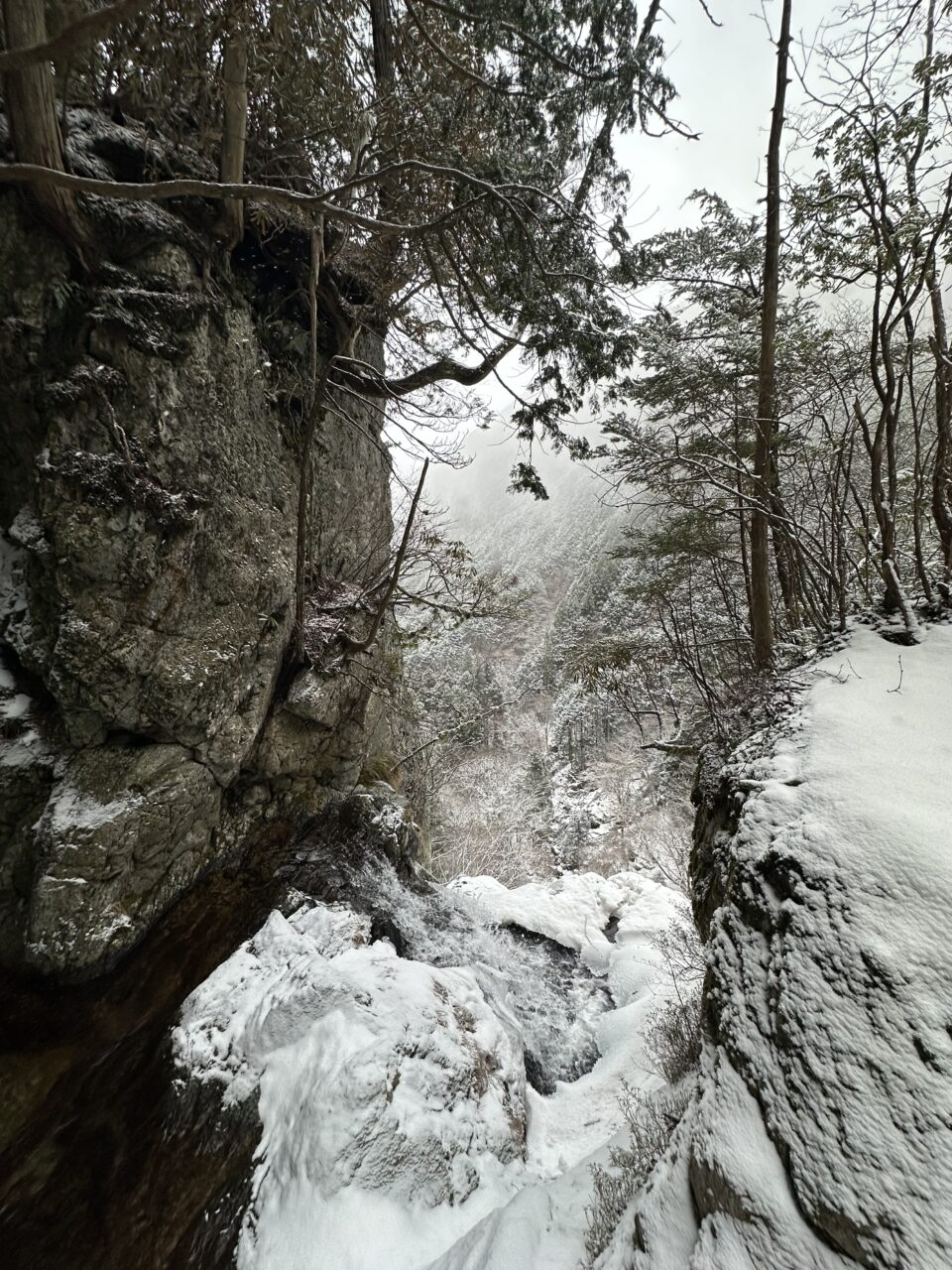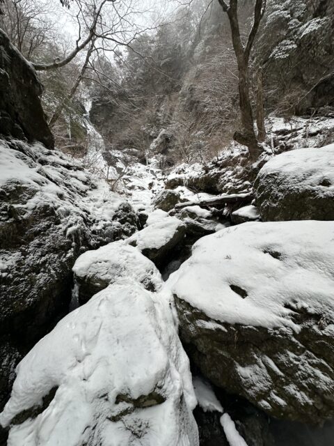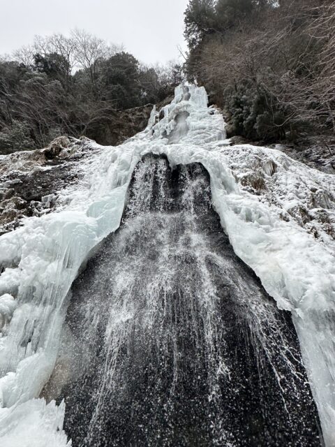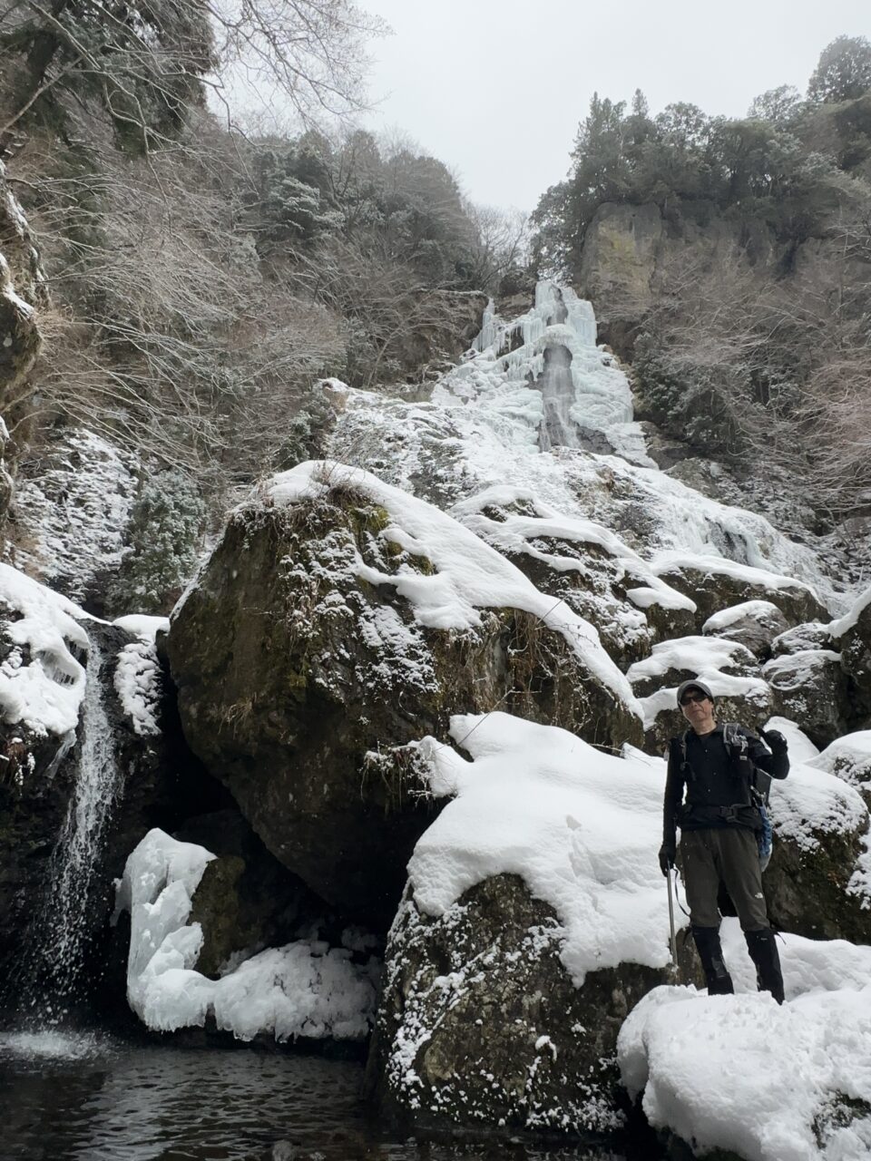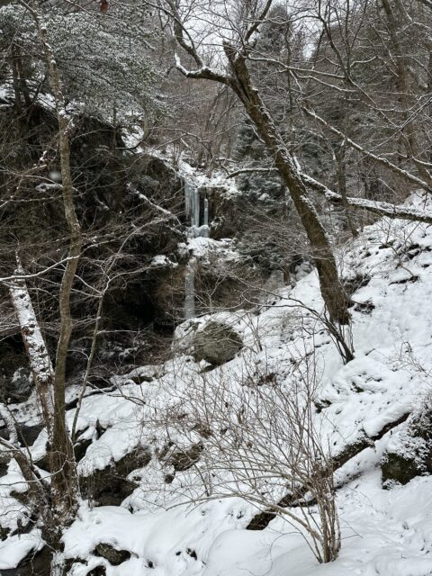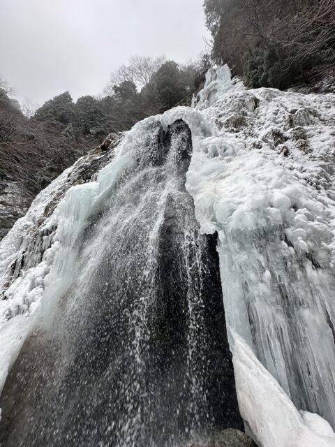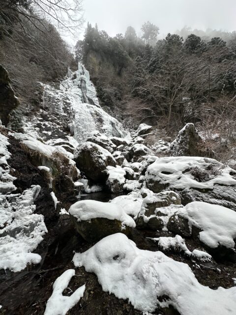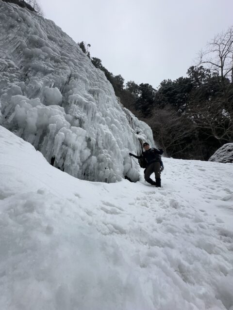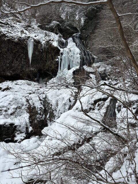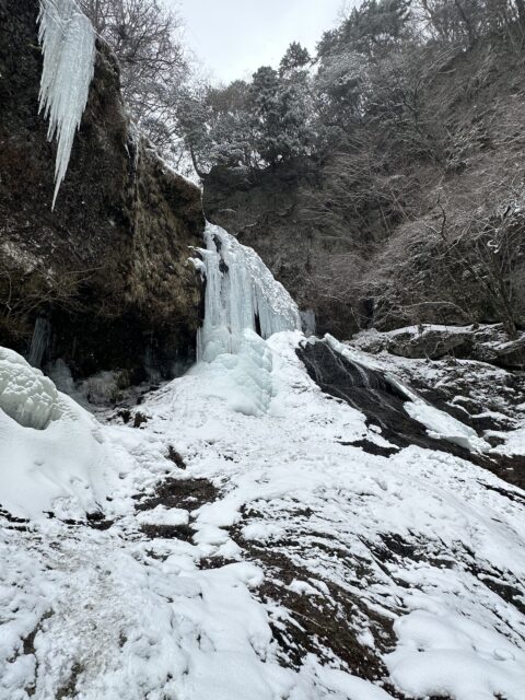 滝壺の雪の下は空洞になっているので確認して近づかないと危険です!