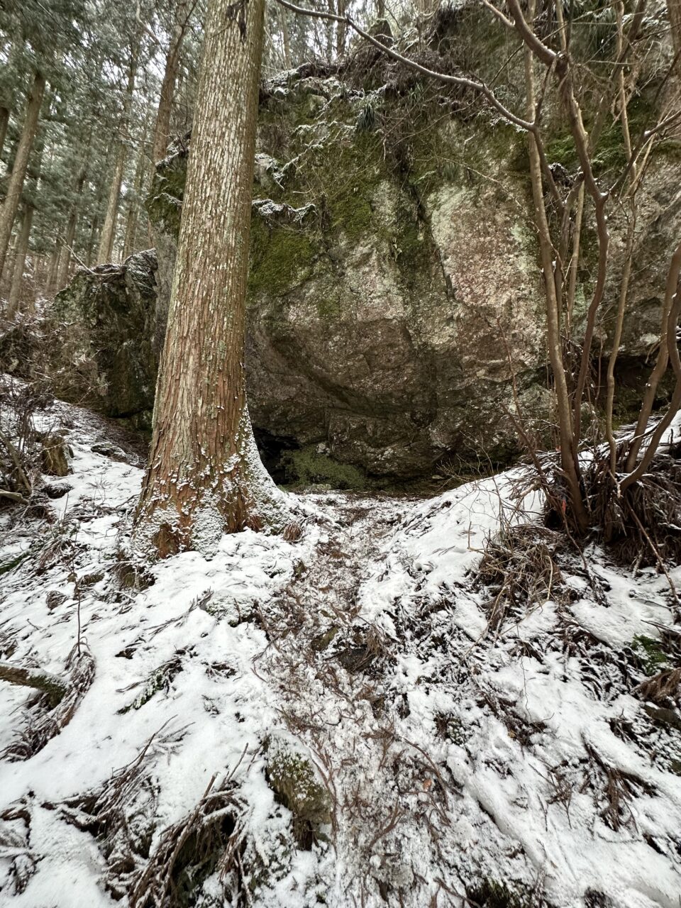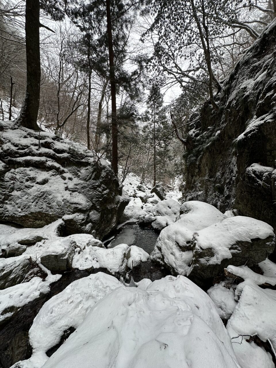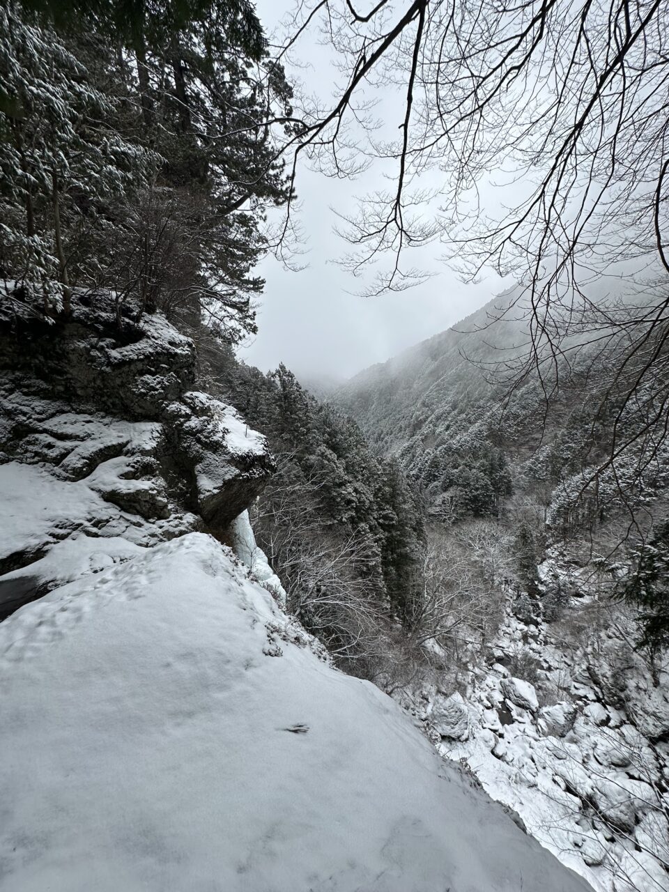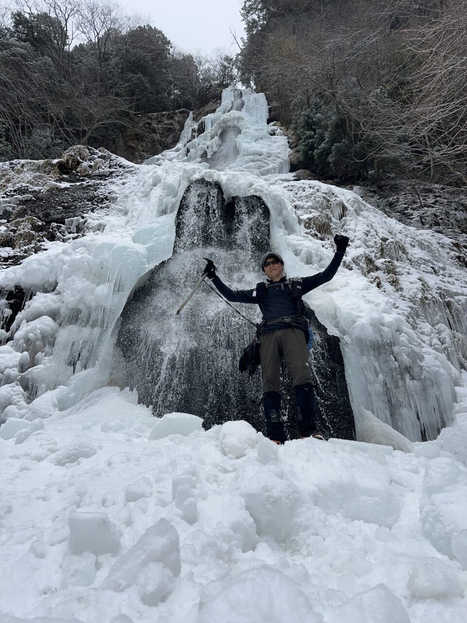 滝壺の雪の下は空洞になっているので確認して近づかないと危険です!