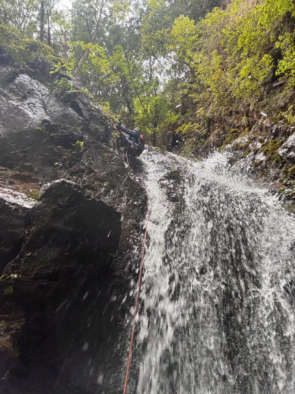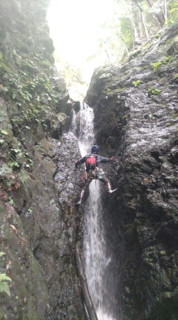 入口はしょっぱいですが、開始10mでいきなり滝から入渓します。5分も歩くと10m直瀑、上部が取水堰になっています。これは巻いて、すぐに10mくらいの直瀑系。これは直登しましたが特に落口がツルツルで悪い。1人目の同行者がしなやかに突破。いきなりシビれます。その後、CSを右にもつ斜瀑5m。これも水流両側もいけますが、どちらも一癖あります。