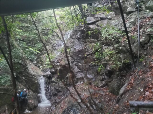 今度は谷が右に曲がり、直瀑15m程度?これは手が出ず巻き。その先に、巻き核心の2段滝が。。。