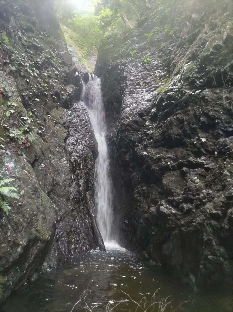 ただ上部はまたゴルジュ状になり、巻けずに滝身の中に吸い込まれるように登っていきます(右から大高巻きすれば巻けたのかな?)。最後は極悪の2段8mに。特に上段落口が極悪。これは3人目の同行者が渾身のダイブで、やはり力でねじ伏せました。本日何度目だろうか、シビれました。こいつもフォローでも恐ろしかったです。
