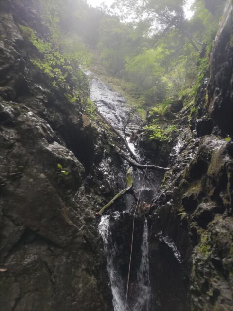 ようやく巻き終え、一息つく間もなくCS滝8m。巻きはさっき以上に難しそう。ここで2人目の同行者の直登力が冴え渡り、正面からねじ伏せる。いや、僕は攻撃力がないのでこれにはたまげました。中間ビレイしてもらって、やっとこさ突破できました。