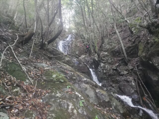 この滝、僕は完全に巻きだと思ってたんですが、当たり前のように直登を始める同行者。ただ、さすがにナメ滝で支点がとれず、途中からは巻き気味となりました。